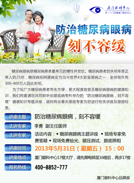 【文章導讀】【名醫(yī)講堂糖尿病眼病防治】5月31日,本周五,糖尿病眼病防治講堂將在廈門眼科中心17樓開講,所有受糖尿病眼病疾病困擾的患者,均可來參與聽講,期間也會免費為所有人免費驗光、