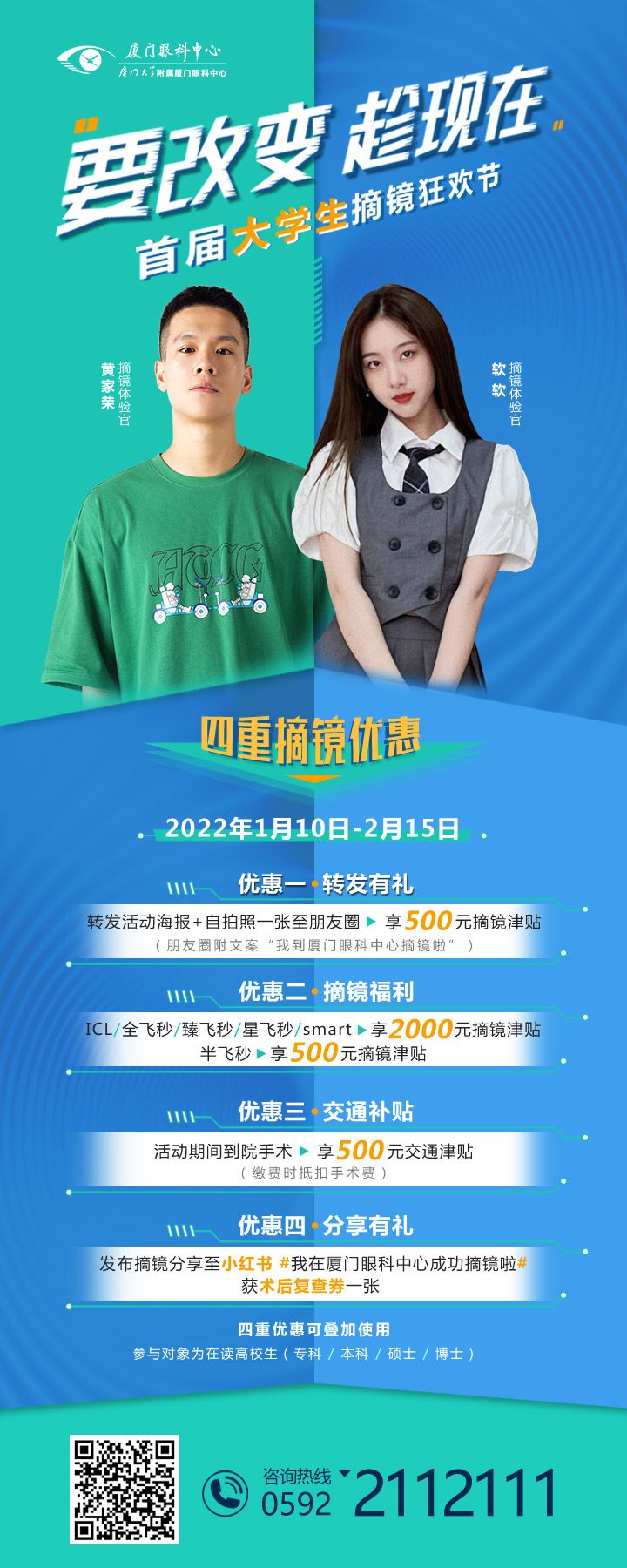 守護(hù)光明,溫暖助力【文章導(dǎo)讀】2022年1月10日-2月15日 廈門眼科中心 大學(xué)生摘鏡狂歡節(jié) 席卷卷卷卷而來 四重摘鏡福利 丟掉眼鏡 丟掉煩惱 要改變 趁!現(xiàn)!在! 讓我們一起做 新時(shí)代有才有為有顏值的高知分子吧 活動(dòng)時(shí)間: